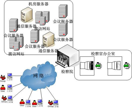 数字有机体互联网控申系统是根据人民检察院的控申业务需求,在数字有机体会议系统的基础上开发而来, 实现基于互联网的远程视频接访,符合检察部门的业务需求。整个系统通过互联网将通信服务器、MCU服务器、 控申服务网站、互联网接访终端等连接而成。如下图所示。